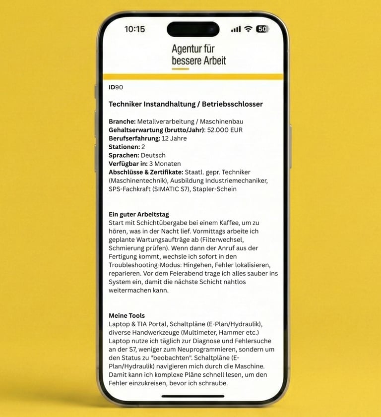 Unser KI-Chatbot führt das Erstgespräch vorab und wir senden Ihnen nur Profile, die wirklich zu Ihren Anforderungen passen. Unser KI-Matching verbindet Ihre Erwartungen mit den Fähigkeiten und Motiven der Fachkräfte.